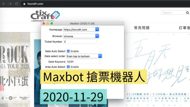 • 搶票程式可能會執行到一半就掛掉,建議實際在搶票時,請開啟出2個瀏覽器,一個是透過搶票機器人。另一個是傳統無外掛手動去搶票,因為如果遇到「搶票的程式掛了」、「官方網站影示錯誤訊息是無連續坐位」或「官方網站改版」,還可以搶看看第二輪或清票。