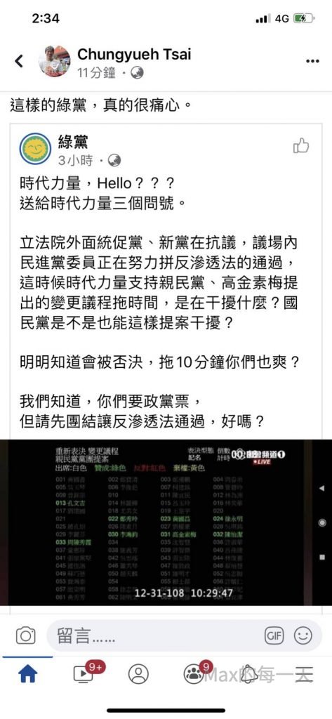今天(2019/12/31)通過了反滲透法案,時代力量的黃國昌被抺黑了一下下,然後也在立法院議會裡替自己漂白。網路上流傳著臉書首度為台灣總統選舉,特別在台灣成立「跨部門工作小組」,將與地區性選舉中心共同監看平台,並即時回應可能出現的威脅。