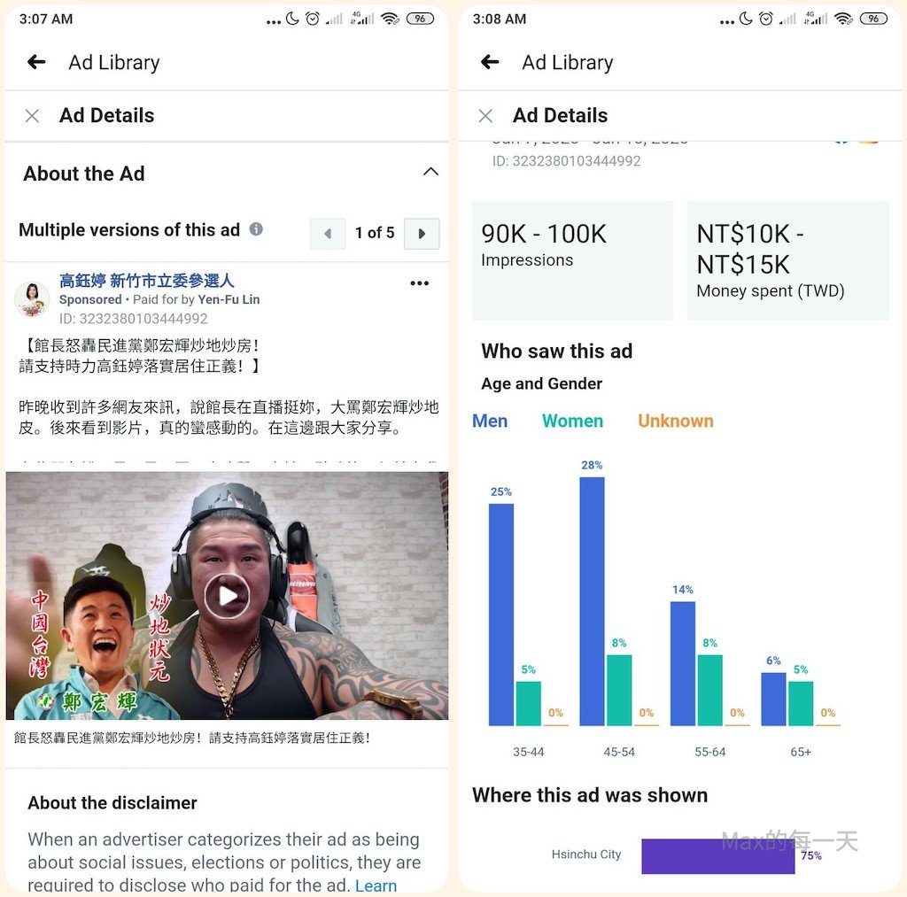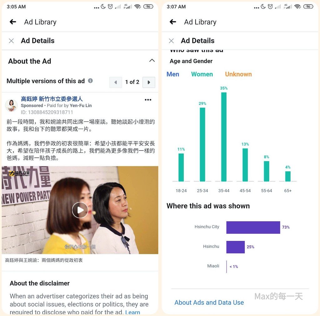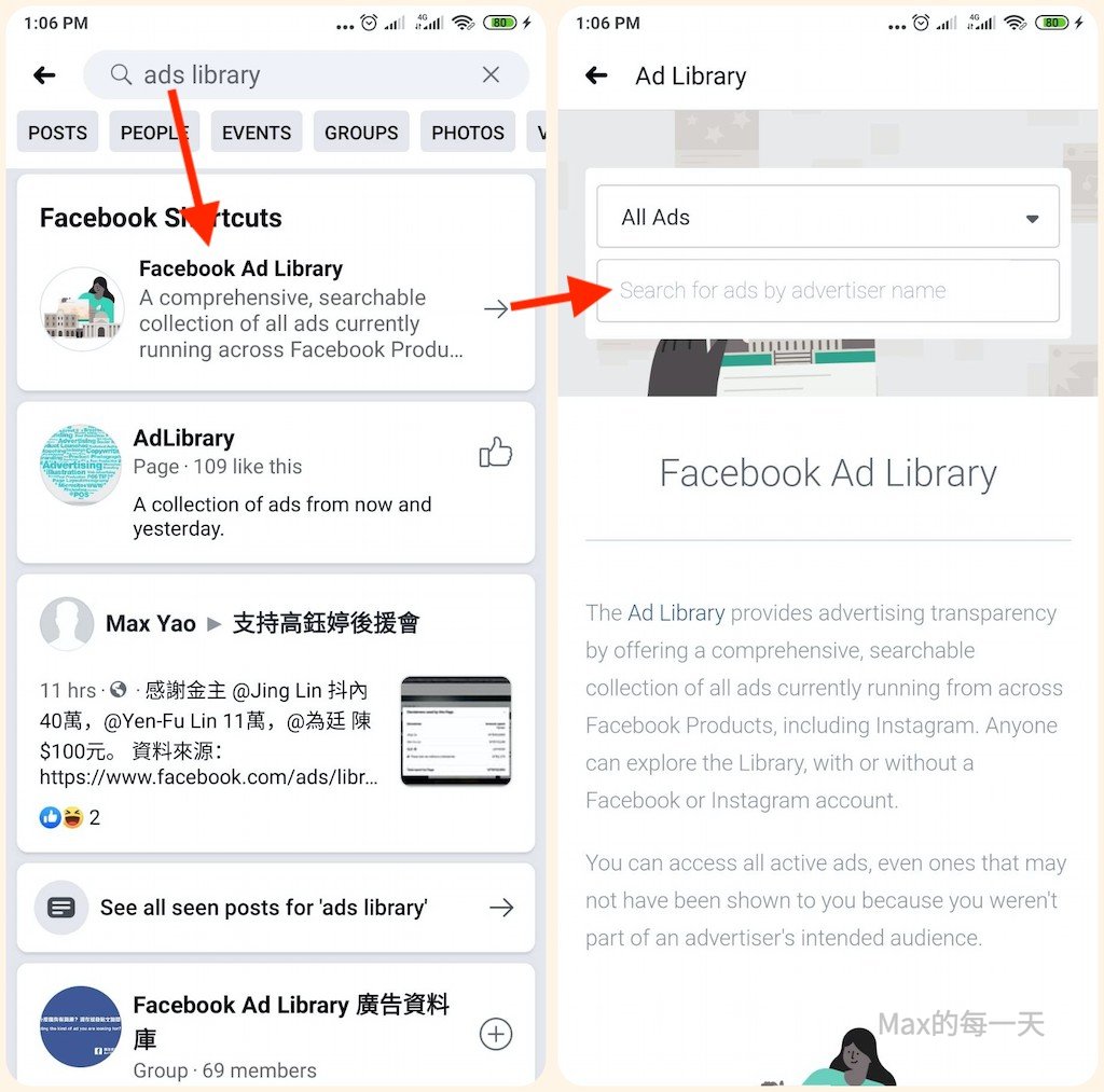 Max 使用網頁版怪怪的,使用手機版就很順暢,直接在 Facebook App 裡搜尋 「Ad Library」 就可以使用了: