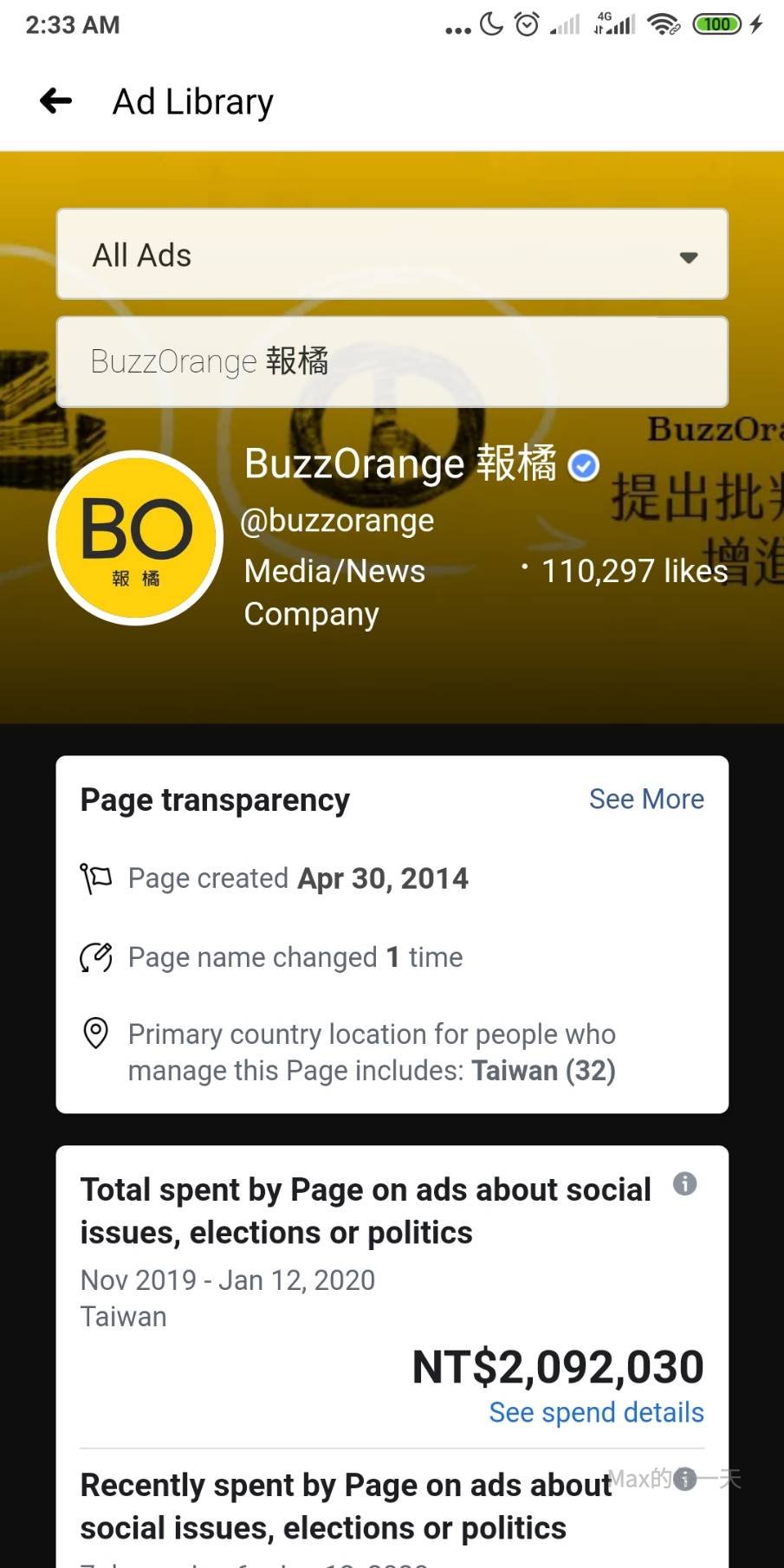 最近30天裡,報橘(戴季全)花了200萬投放政治性廣告,總共103篇