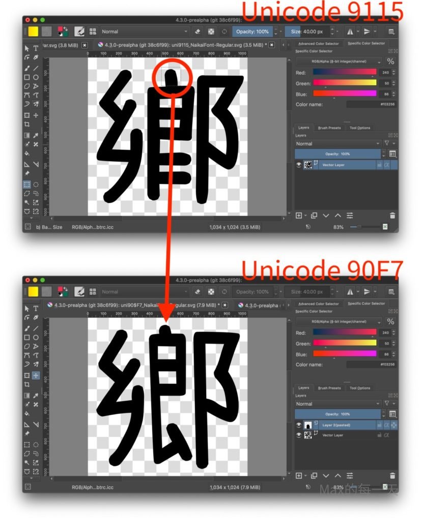 以補 setofont (瀨戶字體)的缺字「鄉」(9109)為例: