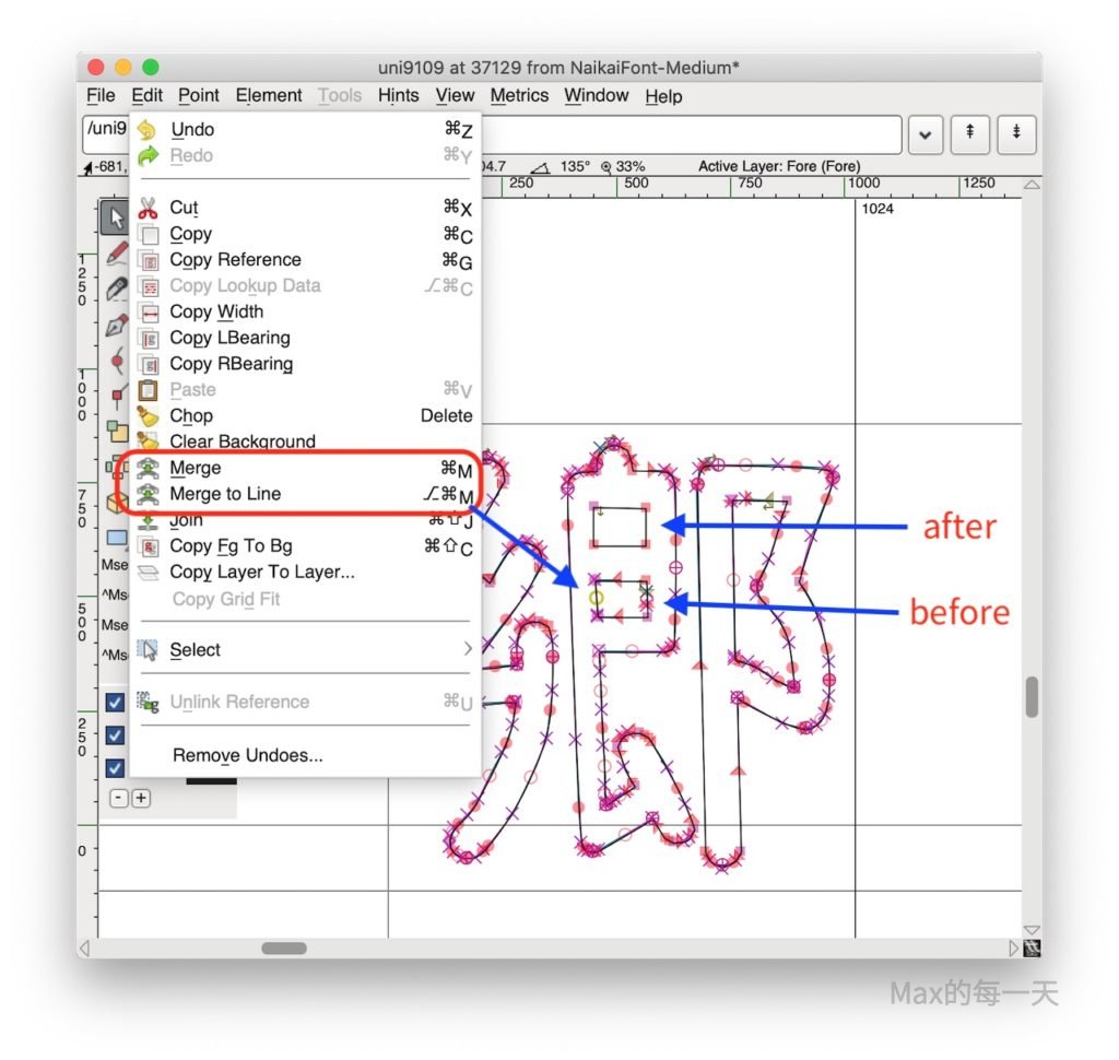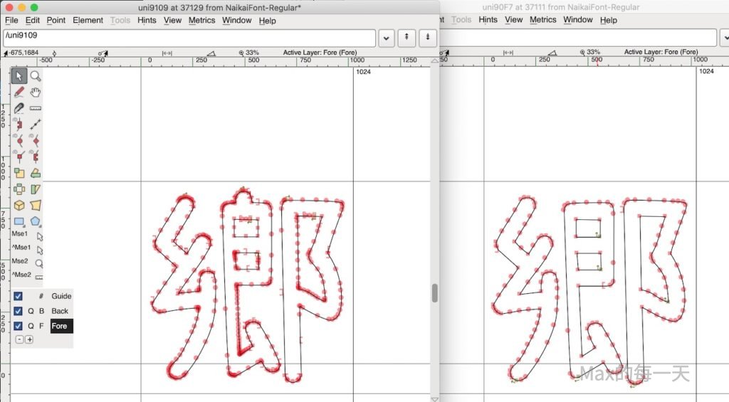 重要:由於是囫圇吞棗,在完全不懂的情況下亂改字型檔,所以最後存檔(Save)前,請執行一次選單裡 Element 裡的 Correct Direction(Command + Shift + D)來修正方向錯誤。