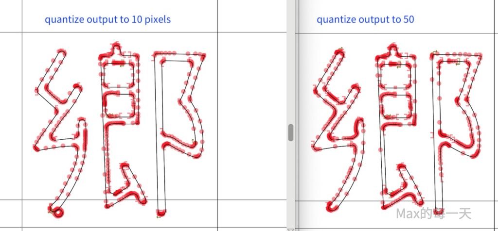 解法:是 potrace 指令,設定 quantize(量化)參數 -u 為 50px,這時候匯出的檔案會再略大一點,長大到 4.5KB,即可是解決在FontForge 裡 Expand Stroke 造成的筆畫的誤判。上面的範例已修改為 -u 50.