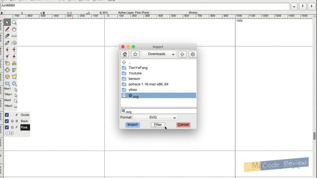 匯入的SVG檔裡有很多的「點」,是因為點陣圖(BMP)轉換到到向量圖(SVG)時多出來的,請在 FontForge 裡使用左上角第一個選取工具(Pointer,熱鍵V)去點擊多餘的點,使用Merge(Command + M)進行點的合併。