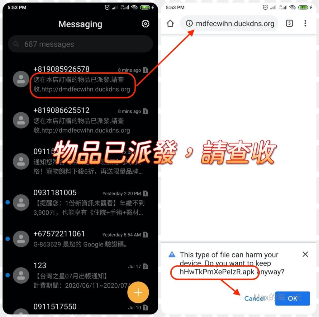 這個釣魚的方式是透過使用者去下載並安裝「不安全的」的APP,來收集使用者的個資和通訊錄,並危害到使用者安全的APP,建議不要去下載,最好是連詐騙用的簡訊裡的網址都不要去點。