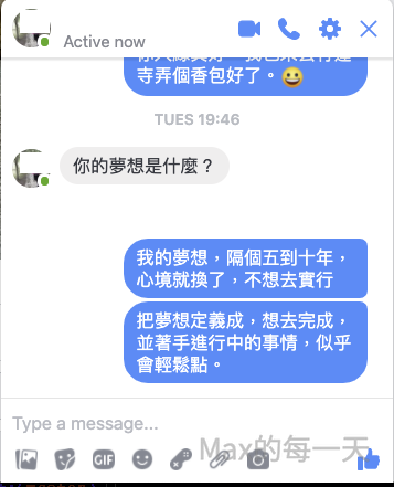 我覺得滿有趣的,目前似乎還沒有想去完成的夢想。我在20年前跑去經營直銷時,設立的夢想之一是「給媽媽過好日子」,因為爸爸似乎不太缺錢。
