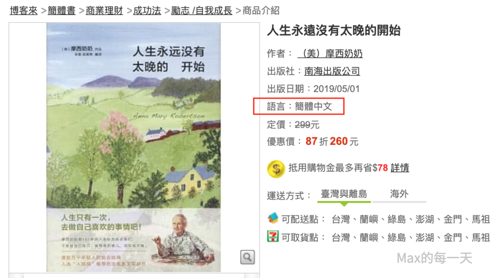 在網路上看到一本有趣的書《人生永遠沒有太晚的開始》摩西奶奶首部人生哲學作品。在台灣似乎還沒有䌓體版,只買的到簡中的版本,2019年出版的賣NT$260, 2014年出版的賣NT$208。購買用傳送門:
