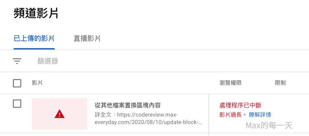 上傳的影片檔大小不得超過 128 GB 或片長不得超過 12 小時,以較小者為規定條件。此外,由於過去的上傳檔案規定與現在不同,因此你可能會發現部分舊影片的長度超過 12 小時。