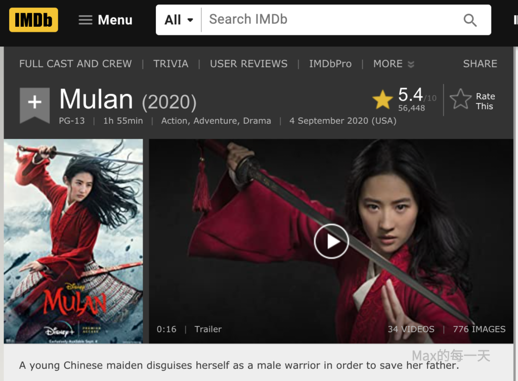 ◎譯 名 花木蘭/迪士尼真人版花木蘭/花木蘭真人版/木蘭傳說 ◎片 名 Mulan ◎年 代 2020 ◎產 地 美國/中國大陸 ◎上映日期 2020-09-04(美國網絡)/2020-09-11(中國大陸) ◎IMDb評分 5.4/10 from 53,314 users ◎IMDb鏈接 https://www.imdb.com/title/tt4566758/ ◎豆瓣評分 4.9/10 from 194991 users ◎豆瓣鏈接 https://douban.com/subject/26357307/ ◎片 長 115分鐘 ◎導 演 妮琪·卡羅 Niki Caro ◎編 劇 勞倫·希內克 Lauren Hynek / 里克·傑法 Rick Jaffa / 伊麗莎白·馬丁 Elizabeth Martin / 阿曼達·斯爾沃 Amanda Silver ◎主 演 劉亦菲 Yifei Liu 甄子丹 Donnie Yen 鞏俐 Li Gong 李連傑 Jet Li 李截 Jason Scott Lee 安柚鑫 Yoson An 馬泰 Tzi Ma 趙家玲 Rosalind Chao 鄭佩佩 Pei-pei Cheng 溫明娜 Ming-Na Wen 曾曉童 Xana Tang 袁文忠 Ron Yuan 唐辰瀛 Chen Tang 道阿·茂阿 Doua Moua 黃谷悅 Jimmy Wong 尼爾森·李 Nelson Lee 李勳 Hoon Lee 饒雪晶 Crystal Rao 袁之正 Roger Yuan 仁成外橋 Jen Sung Outerbridge 加里·揚 Gary Young 歐文·鄺 Owen Kwong 烏特卡什·安邦德卡爾 Utkarsh Ambudkar 錢姆·艾希勒珀拉 Chum Ehelepola 大衛·T·林 David T·Lim 詹森·鄭 Jenson Cheng