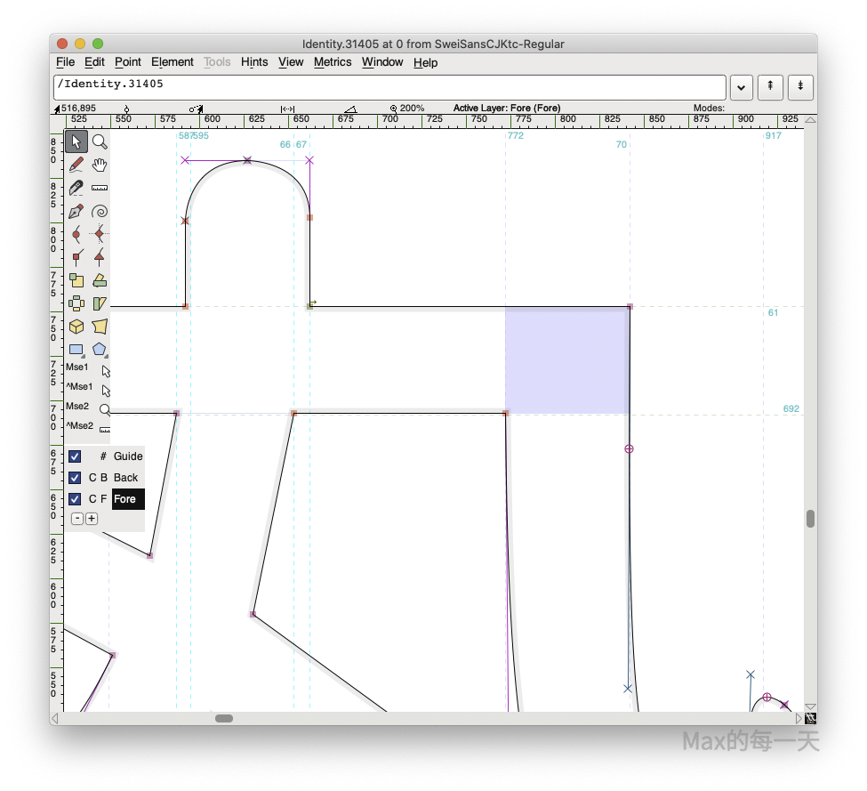 - 演算黑科技將字體筆觸變斜改造,請參考 /python/ 目錄下的腳本檔案。透過調整程式碼,也許也可以產生出新的有趣字型。目前的程式應該還有很多錯誤或需要再加強的地方。請先把要處理的字型,透過 FontForge 開啟,並另存 FontForge 的專案為資料夾格式(.sfdir),最後就可以透過Max的 Python 程式去處理產生出來的檔案。