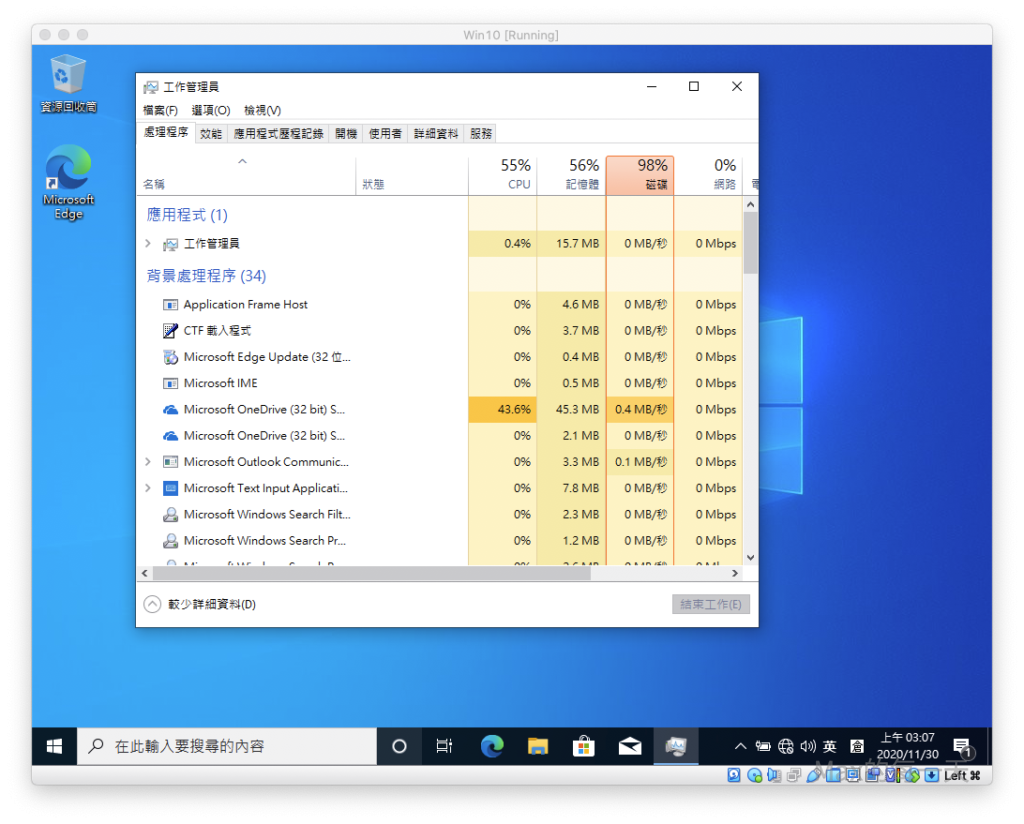 安裝好後,登入完帳號/密碼,電腦卡住 7分鐘,只剩滑鼠可以移動,接著終於可以開啟「工作管理員」,一看是CPU 和 磁碟的 I/O 分別佔用掉 100%,造成系統反應很慢。