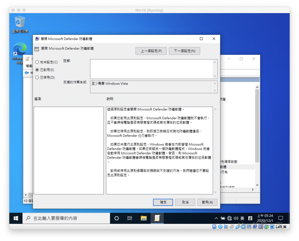 在左側視窗點下後,然後在右邊的視窗中,點二下「關閉Windows Defender防毒軟體」,之後會跳出一個新視窗: