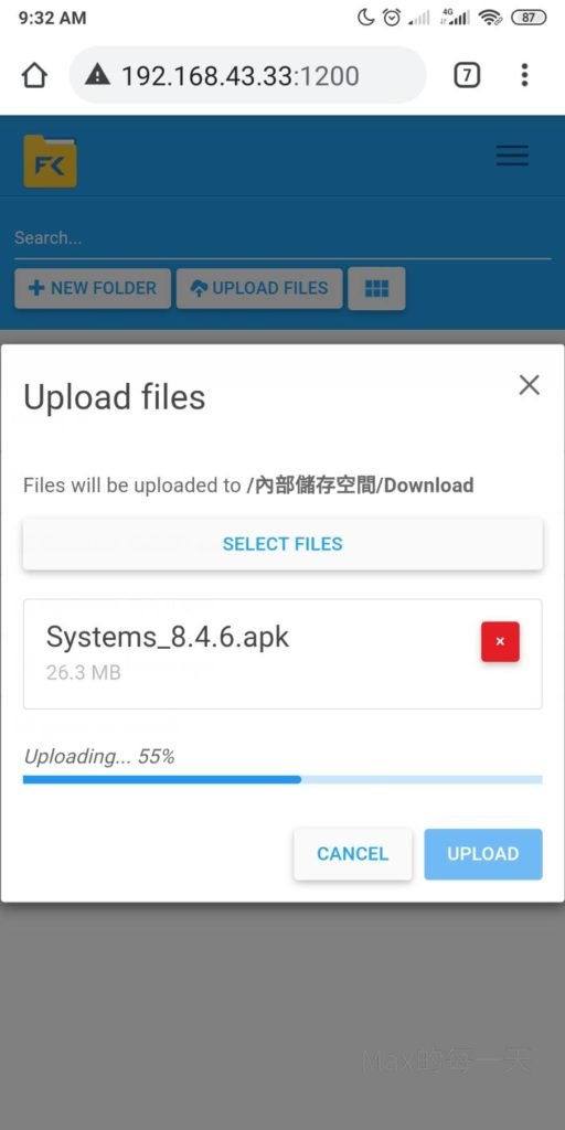 Step 5:點右上角的「三」的圖示,可以顯示隱藏的區塊,請再點「UPLOAD FILES」(上傳檔案),再點「SELECT FILES」(選擇手機裡的檔案),找到手機裡的APK 檔案後,點「UPLOAD」檔案就會上傳到小米盒子裡。