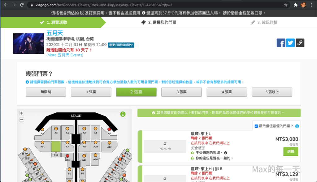 NT$2,880 的門票在專業合法的黃牛票網站viagogo,可以賣到1張為NT$15,000,含系統的平台費用為$19,382元,是原價的6.7倍。