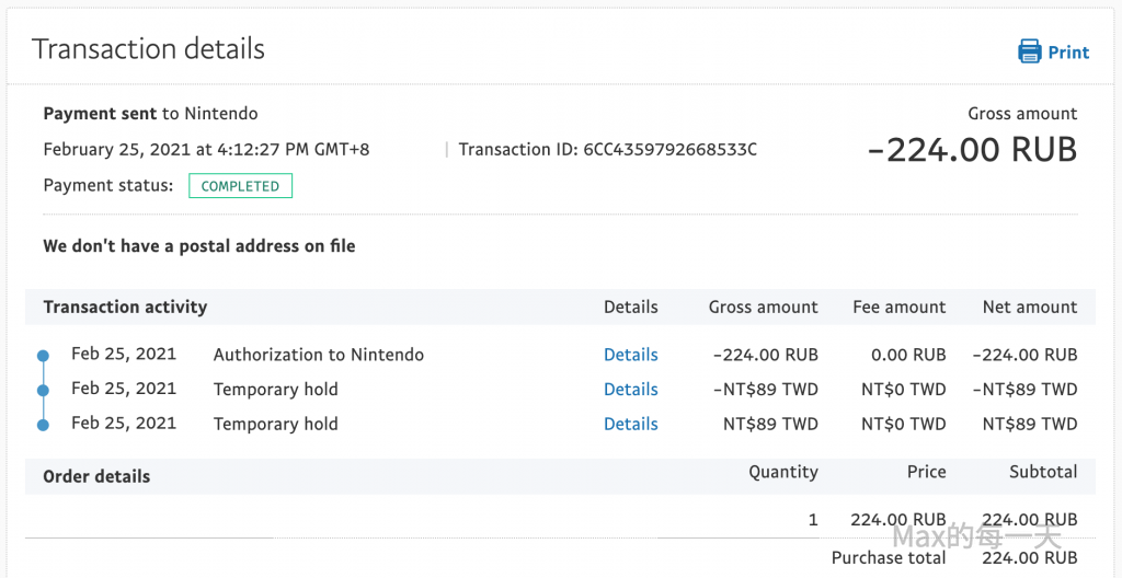 在實際上以 224 RUB 買「高高興興動物樂園」來說,在 PayPal 換成台幣支付會是付 NT$89 TWD, 而不是遊戲箱子App的裡較優匯款的 NT$84 TWD,PayPal 因為沒有另外收手續費,應該是調整在PayPal的較貴匯率裡。