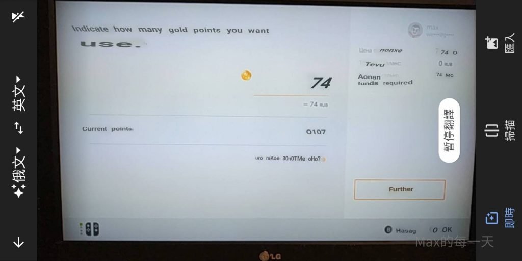 左側第一個金額是遊戲的總金額,目前是 74RUB,目前Max在俄羅斯的黃金點數有 107點,所以可以直接折抵黃金點數來購買遊戲。