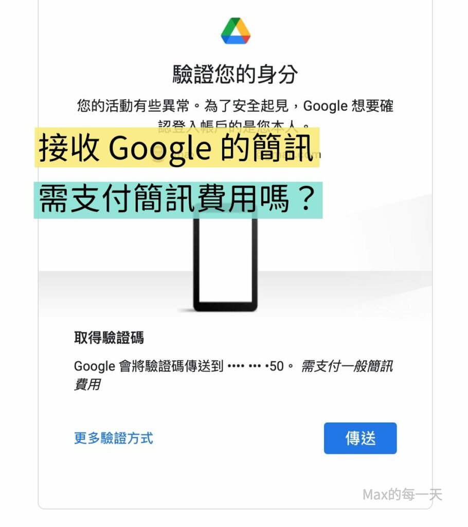 Google 在網頁上寫的訊息是「需支付一般簡訊費用」,查了一下其他網友的分享,如果你的台灣門號是正在使用台灣地區的基地台提供的服務,收簡訊不會被另外收費。