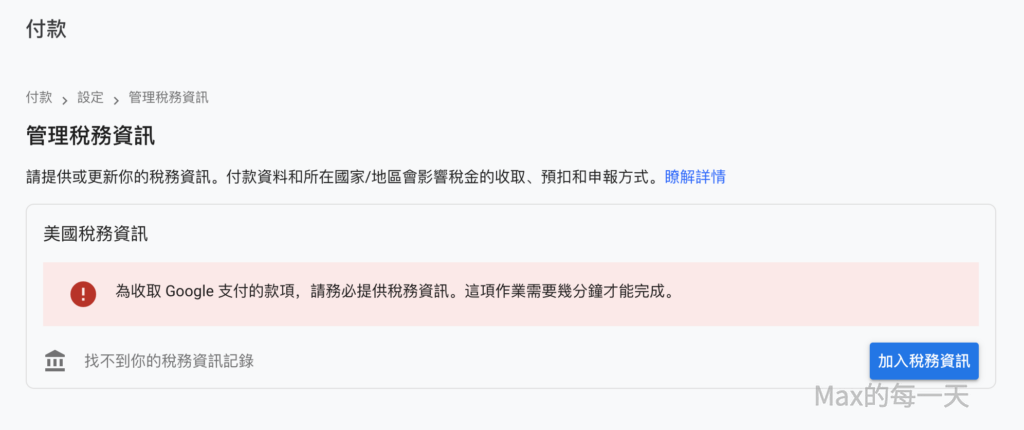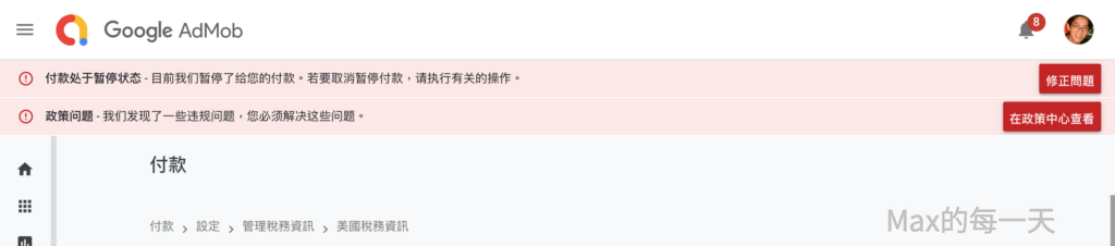 在Google Adsence出現下面的畫點,點選「修正問題」就可以開始更新「稅務資訊」。