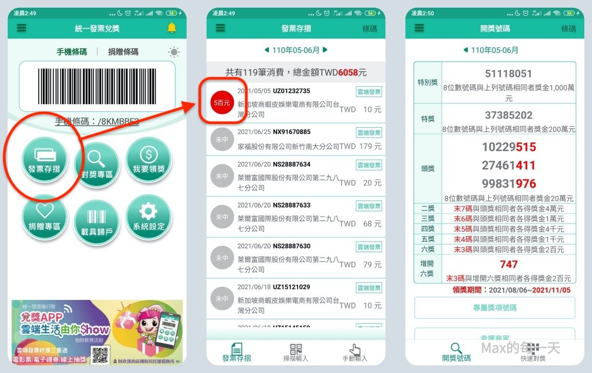 Max的這期5/6月發票有中500元,第一次看到這一個神奇的$500元金額的獎項,真是太棒了,感謝蝦皮購物的APP 買了10元小美冰淇淋讓我中獎,如果有使用蝦皮的APP記得把發票「歸戶」到財政部的統一發票APP裡自己的帳戶裡。