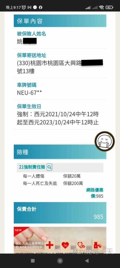 用手機點一點,大約5分鐘左右,準備好行照上的資料,就完成投保了,下面是順便幫我的上一班超級忙的大姐去投保。