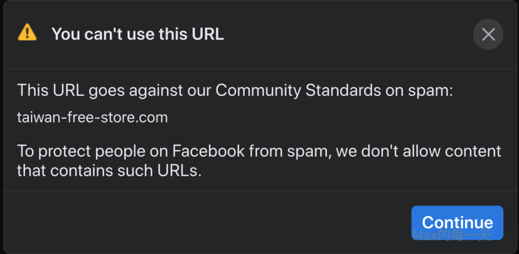 Facebook 居然可以檢測的到這一個網址是垃圾內容!好厲害,希望有一天 LINE 也能做的到。