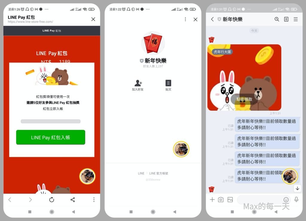 如果是在「手機」裡點選上面的網址,會顯示下面的圖左1,點了假的活動後,點綠綠的按鈕,會分享網址給LINE的朋友,如果點了5次綠色的按鈕會彈出中間這張,長的會誤以為是 LINE 的官方帳號,其實是一般的民眾。真的加入好友後,就會變成右邊的,實際上,並不會收到任何的錢,怎麼耐心等待都一樣。