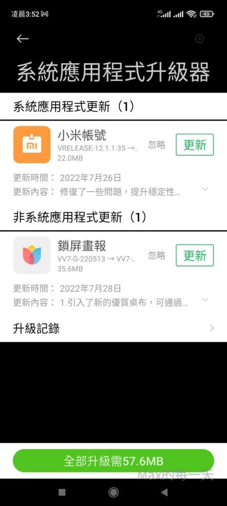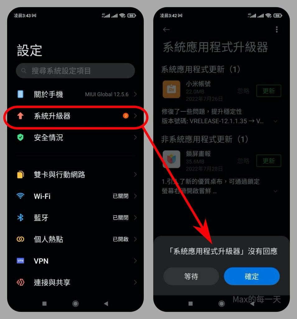 最近手機的系統提醒的地方,會顯示2個系統應用程式可以更新,可是點了「全部更新」或是單純地點進去「系統升級器」程式就掛掉了,會顯示沒有回應,問我要「等待」還是「確定」,點確定會直接關閉掉程式,點等待,等到天荒地老,還是無解。