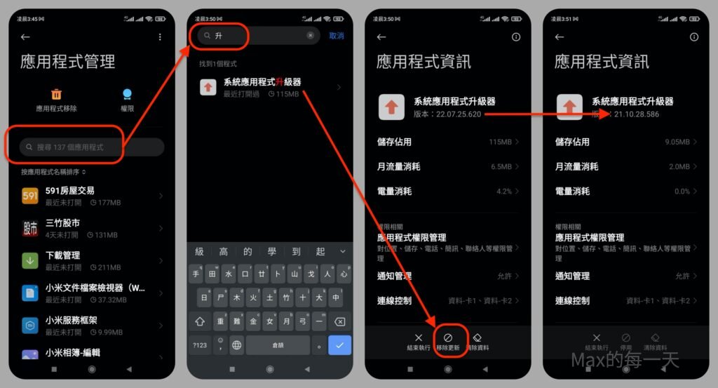 在應用程式管理的輸入框,輸入關鍵字「升」就可以點到「系統應用程式升級器」,再點「除點更新」就可以把原本的 22.07.25.620 版降回系統預設的 21.10.28.586 版,就可以正常地升級系統應用程式。