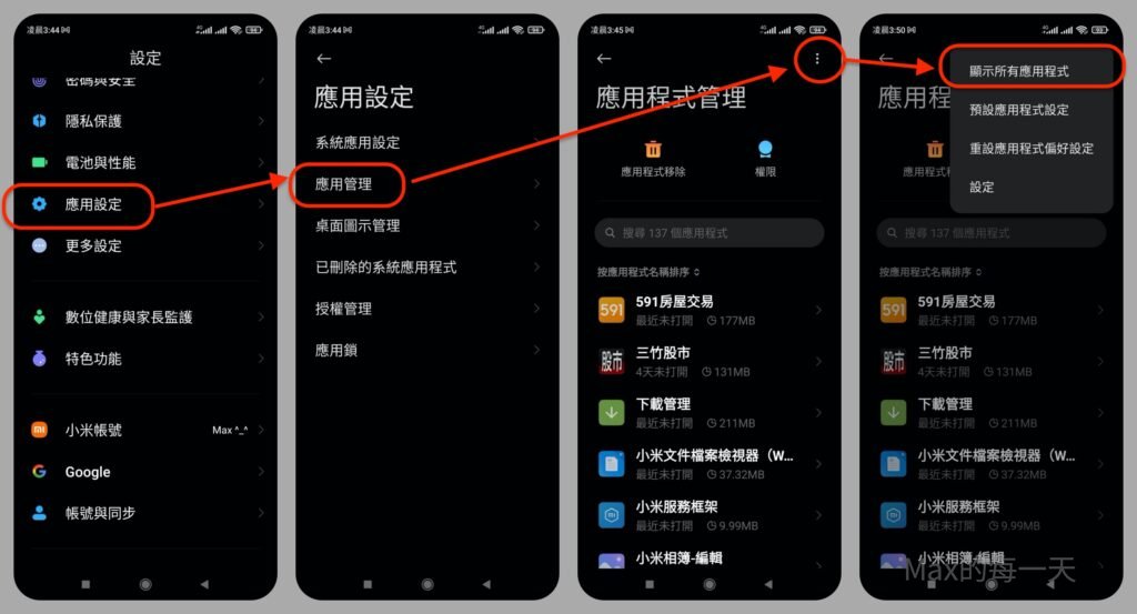 點「設定」-「應用設定」-「應用管理」-「…」(在右上角)-「顯示所有應用程式」