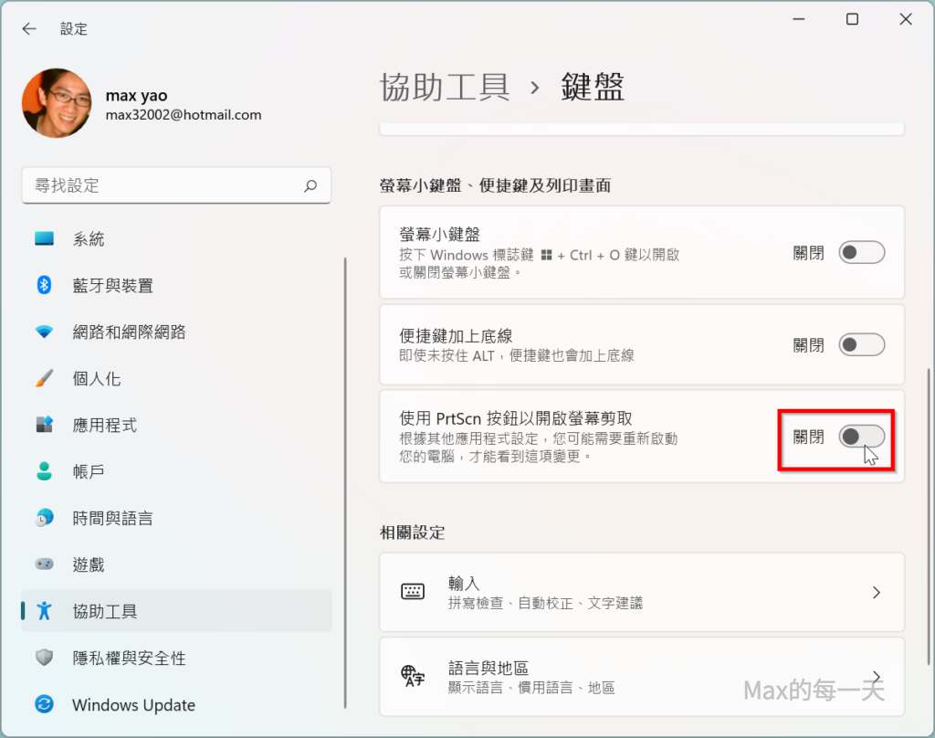 由於熱鍵會互相沖突, 內建系統已經使用了熱鍵, 想要在 Greenshot 使用 PrintScreen 鍵的話, 要先關閉系統內建的截圖功能, 先到設定 – 協助工具 – 鍵盤 就可以關閉系統去使用 PrtScn 熱鍵.