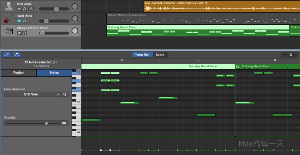 上圖裡,Hard Rock (第2)軌就是Max純手工亂彈的噪音,Classic Electric Piano (第3)軌是在GarageBand 用滑鼠指標去點擊出來的和弦,有試過使用 Teddy 的 GarageBand 教學影片的 #12 Groove Track節拍修正, 讓亂彈有整齊一點,聽完像是較和諧的噪音,呵呵。
