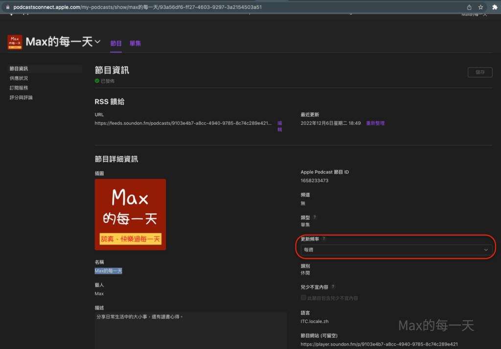實際測試,Apple Podcast 大約2小時就可以開通了,只是比較特別的是,Apple Podcast有多一個必填的欄位是「更新頻率」,如果你不知道「更新頻率」的欄位內容要選那一個的話,可以選「每周」更新。我猜這個應該不是強制要每周去更新,只是讓聽完之後覺得好聽的客人知道,下次何時可能有新的內容。