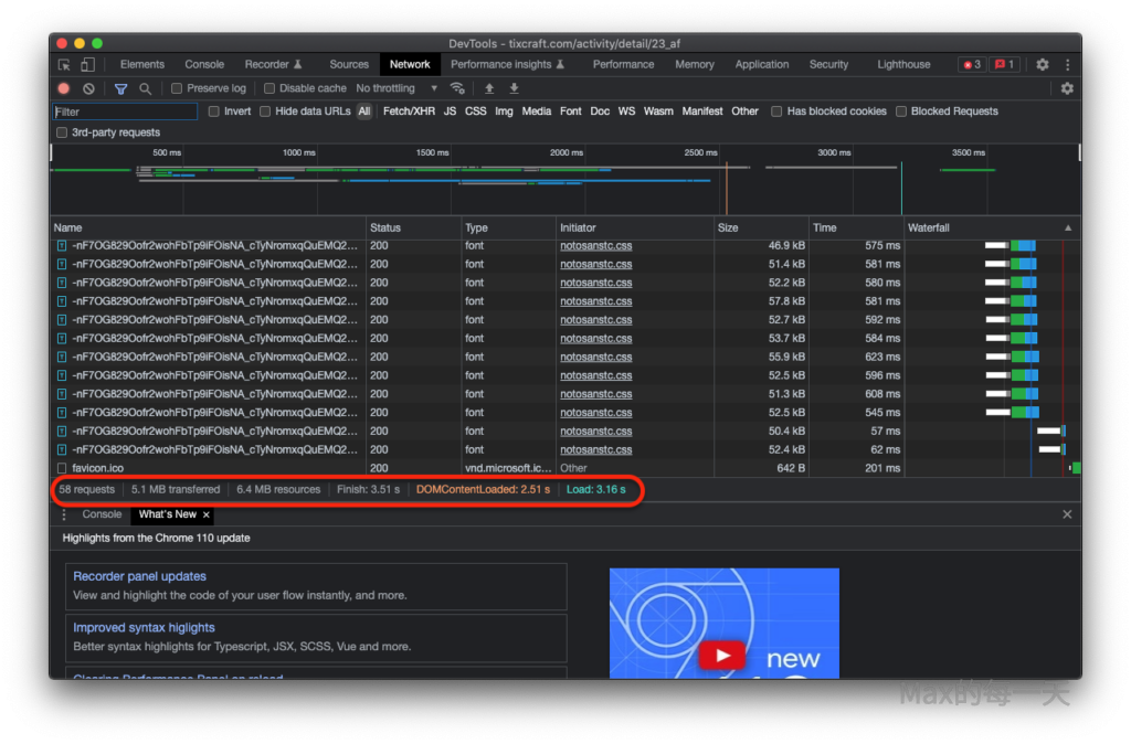 在 chrome 先使用 Cmd + Shift + Del 鍵清除 chrome 下載的快取檔案後。上面的網頁內容總共5.1MB,重新下載,,花3.16秒下載完,網路是用台灣之星4G的網路。