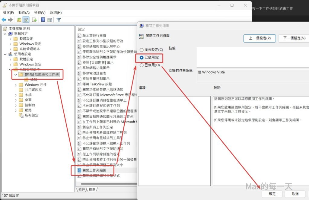 在右側清單中找到名為 關閉工作列縮圖(英文名稱為 Turn off taskbar thumbnails)的項目。對該項目連點兩次滑鼠左鍵開啟設定視窗。在視窗左上方將狀態從 未設定 改選為 已啟用。點擊下方的確定按鈕儲存變更。