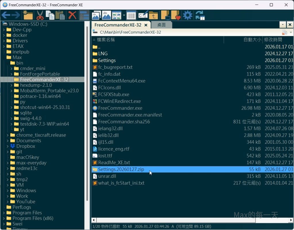 分享Max的設定檔, 這個壓縮檔裡的 .ini 檔, 要先”關閉” FreeCommander 程式後, 再用 Windows 的檔案總管覆蓋回去, 就可以套用到我的 FreeCommander 設定值.