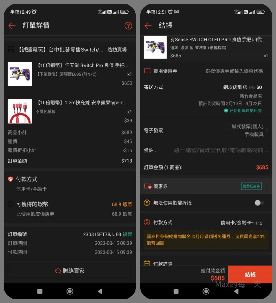 然後, 我看中一支超可愛的switch手把, 是漆彈造型的, 如果是在蝦皮switch手把銷售排名第6的商店賣$650, 但運費$45元, 只能使用”運費折抵券”, 讓$45元運費變$29(折扣$16), 如果是在蝦皮switch手把銷售排名更前面的商店買是$685, 可以完全折抵運費, 排名第6的商店買, 還可以總金額打9折, 更划算.