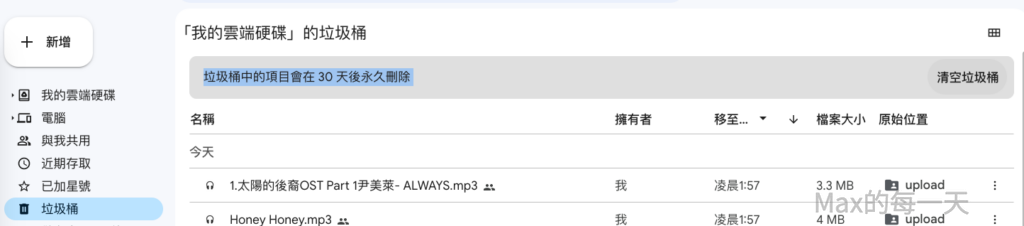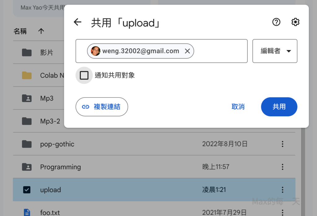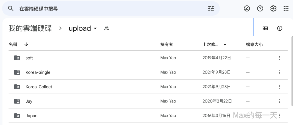 說明:在分身帳號的Google Drive 裡,可以看到擁有者,還是 Max Yao (主帳號)。