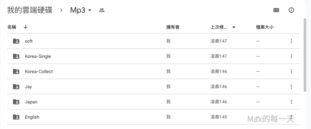 這時候到分身帳號裡的Google Drive 的 /Mp3/ 目錄,就可以看到擁有者變成分身帳號: