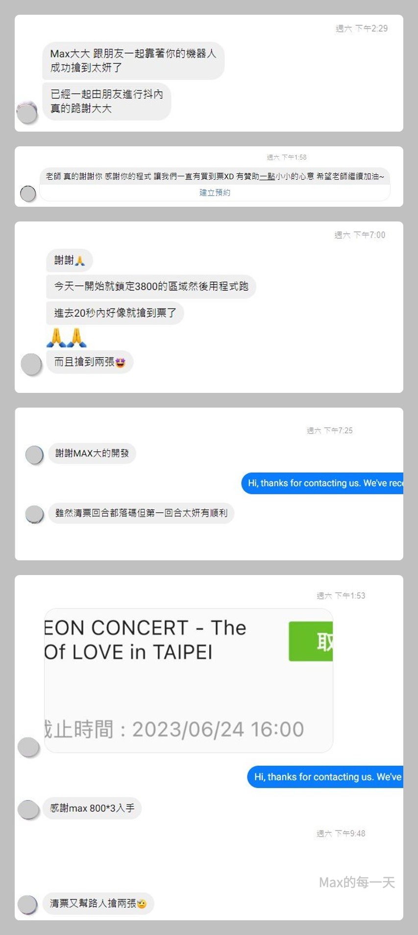 分享有搶到票的網友們的私訊,當然還是有很多人沒搶到票也有傳訊息回報。