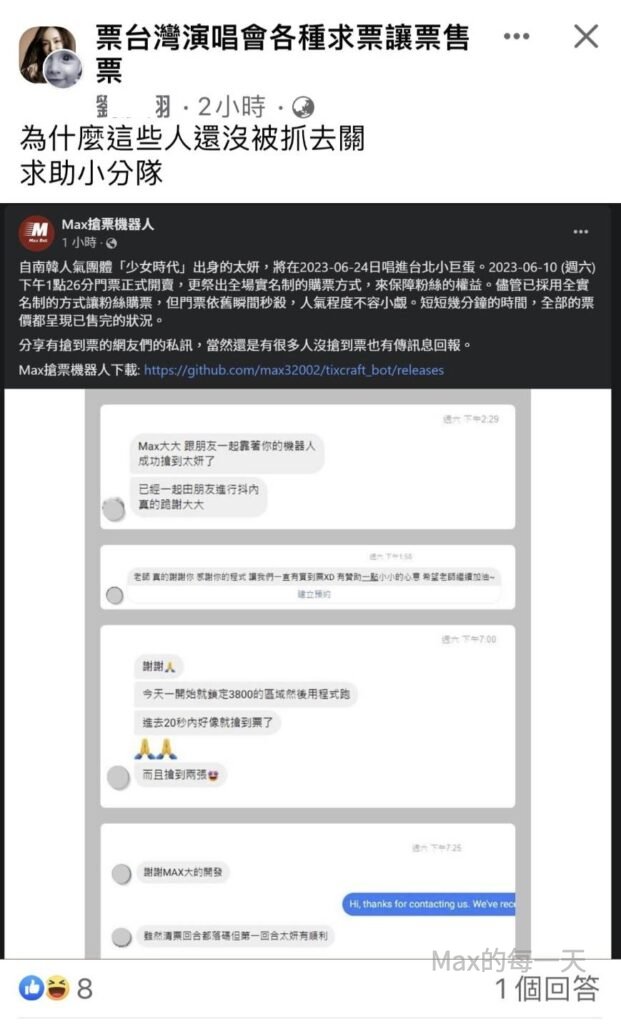 Max搶票機器人下載: https://github.com/max32002/tixcraft_bot/releases