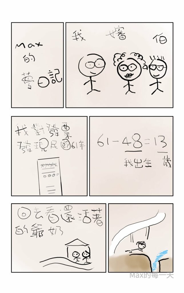 接下來的劇情是我開頭著手對統一發票,然後又從一個包包裡摸到一張陳年古董發票,開出發票的日期是民國61年,我跟嬸嬸說,哇這張發票開出來的時候,我才13歲,這時候13歲在夢中的推測方式是,我好像是8字頭結尾,如果是58年,那我也才3歲,48歲的話,就是13歲,感覺上我應該是48年出生。(回到現實世界就知道,呵呵,發票是我出生之前的)
