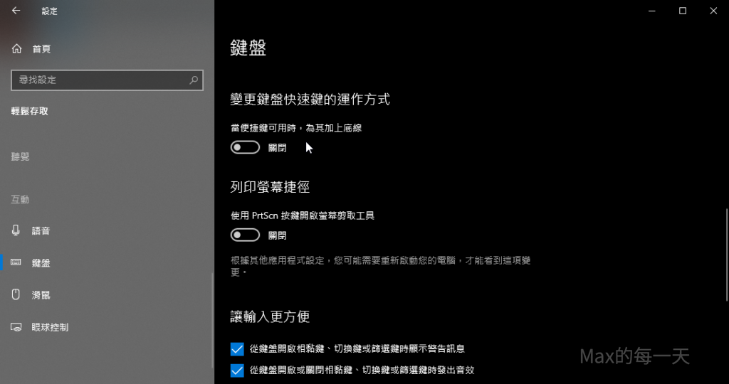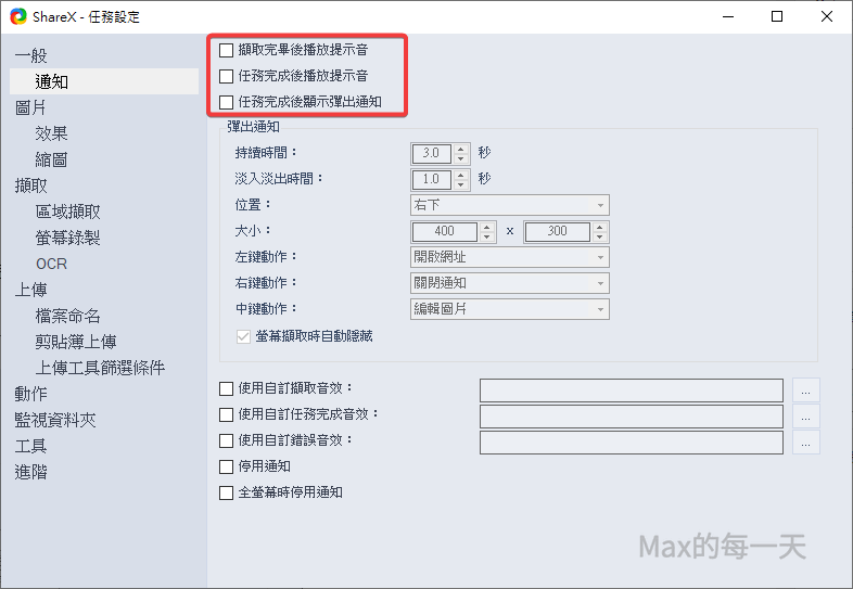 由於預期每次的截圖都是在一瞬間就完成,有提醒反而讓畫面閃動,多此一舉。但也可能有人會喜歡這個提醒的功能。下圖預設3個勾是打勾的,我個人覺得很吵,所以全關了。