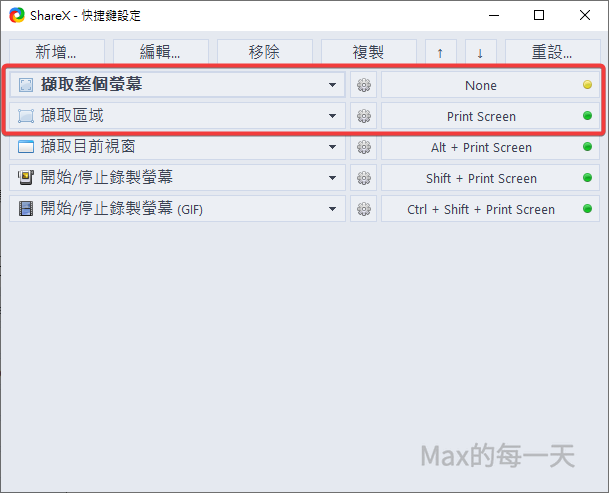 其實, 只需要一組就夠了, 就是 Print Screen, 因為 ShareX 會自動偵測滑鼠坐標是否有遇到視窗,所以也不需要去記這些熱鍵。