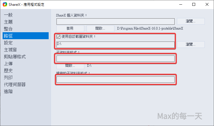 - 勾選, 使用自訂截圖資料夾, 指定到自己的熟悉的、預期的資料夾。