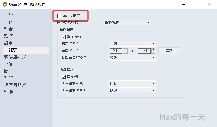 取消勾選「顯示功能表」(Show menu), 這個「主視窗」(Main window), 類似縮圖的管理員。