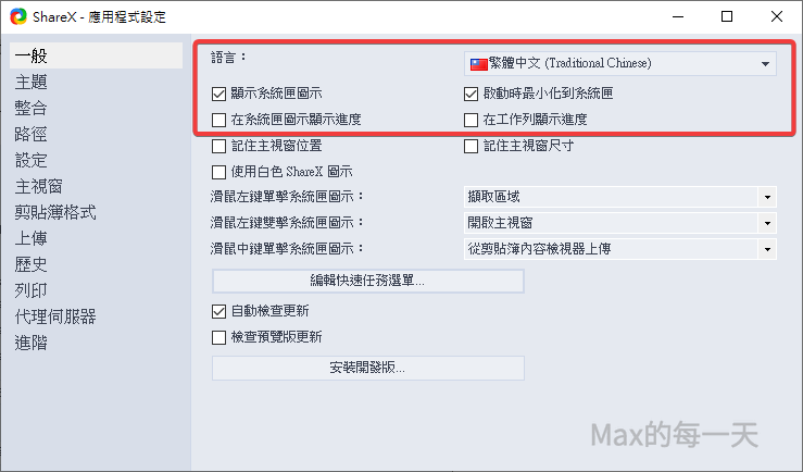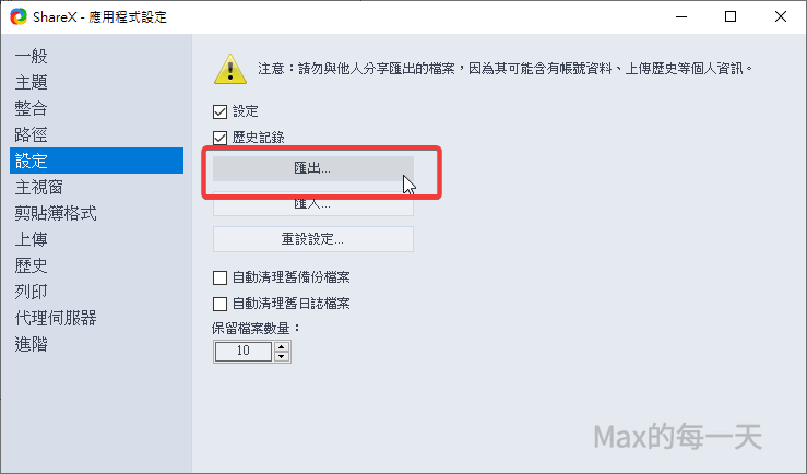 在「全部」的設定值設好後, 請在這裡匯出設定值, 並把檔案備份到雲端硬碟上,如果遇到重灌電腦,或是ShareX 更新就可以省下設定時間。