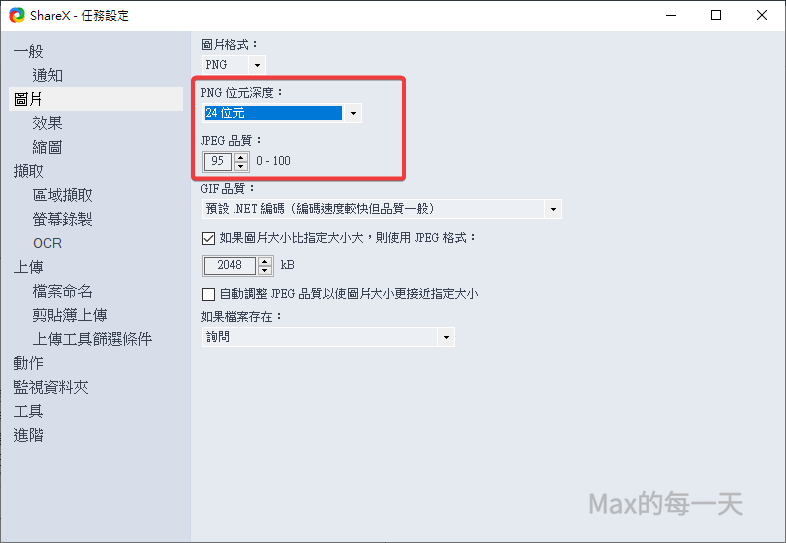 A:圖片格式預設值是PNG 格式,我以為改用常見的 Jpeg 會有較佳的效果, 測試的結果是 ShareX 裡使用 PNG 格式效果最好, 以截取 ShareX 的執行畫面來說, 使用 Jpeg 格式, 把 Jpeg 品質設為 95 情況下, 截圖出來的檔案大小為 80KB, 但是在使用 ShareX 編輯完圖片後, 會只剩 40KB, 而且圖片裡的品質會變的極差, 可以看到很多明顯的顆粒, 但是改用 PNG 格式,截圖大約在 17KB, 而且品質極高, 在使用 ShareX 編輯完後, 也是維持在 17KB, 而且圖片裡的品質一樣在極高的狀態, 有可能是因為 PNG 檔案在對顏色數低於畫面內容不複雜的情況下, 適合使用。