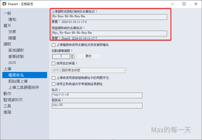 預設是只有隨機一組的亂碼為檔名, 由於習慣 macOS 裡的時間格式命名, 可以點擊輸入框, 可以看到在 ShareX 裡可以使用的參數有那些, 用這些規則來決定預期的截圖檔名, 第一欄我是使用 :