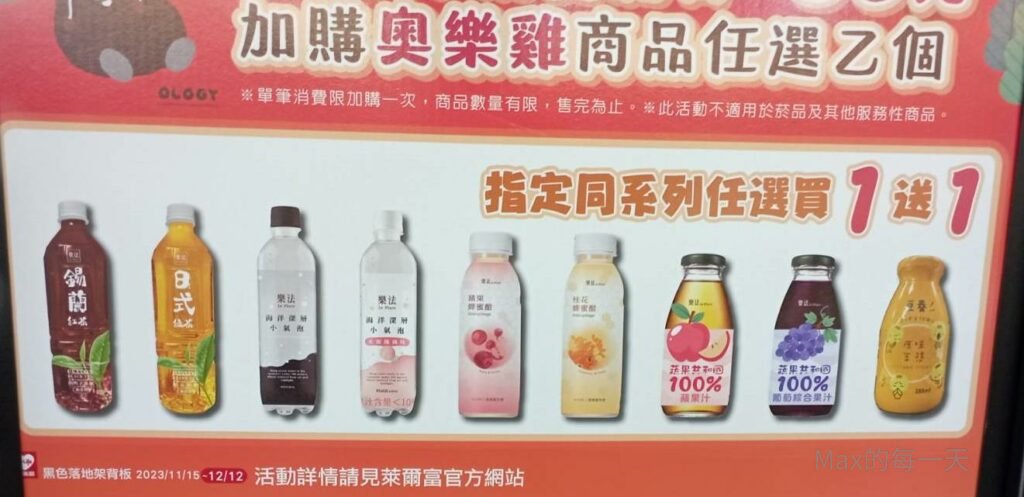 到 2023-12-12 前樂法系列的部份飲品, 買一送一,紅茶滿好喝的 $29元可以買到2瓶,綠茶無糖的,雖然也滿便宜,和健康,但接受度較低。