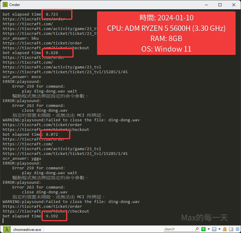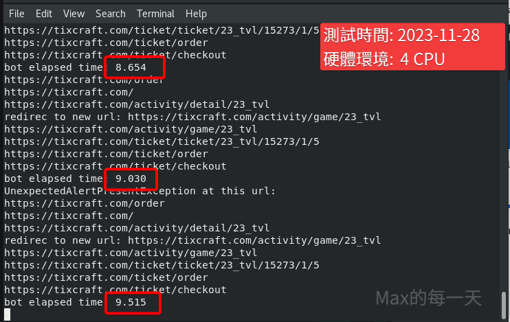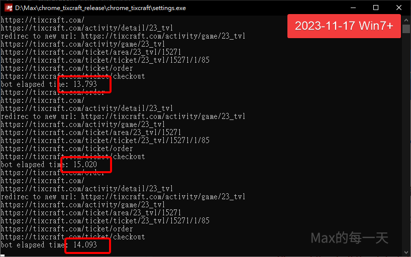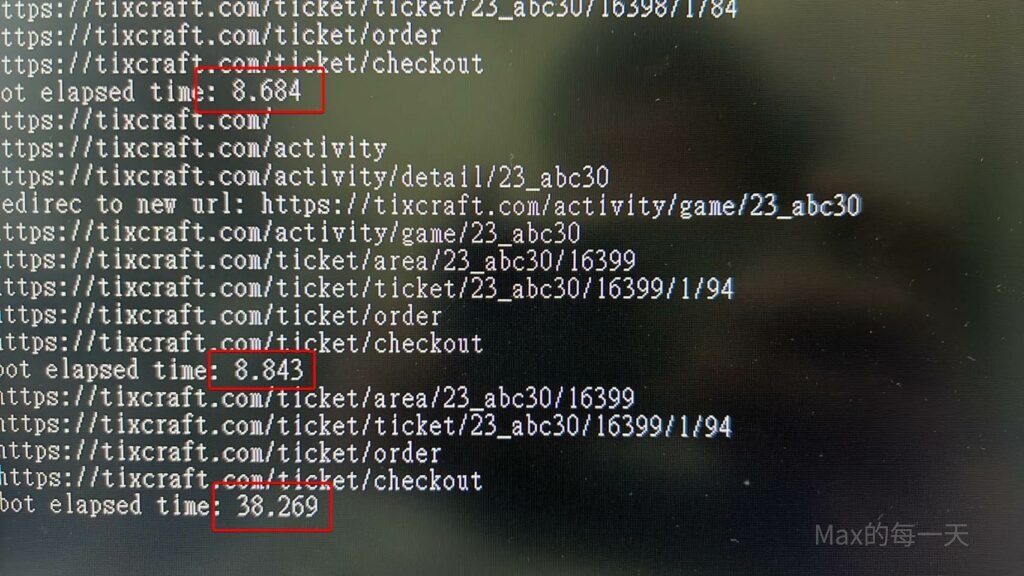 在MaxBot的執行視窗之中,可以看到目前瀏覽中的網址還有搶票程式除錯用的訊息,在網頁遇到售票系統的結帳的畫面時,MaxBot的執行視窗會顯示從挑日期到最後結帳花了多少時間。